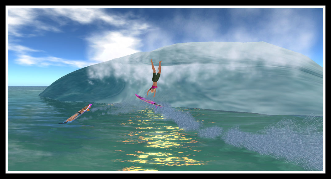 If you have followed my blog, or my Flickr photostream or if you know Jac or me, you are aware that we have been part of the SL surf community for a few years. Jac maintained a surf sim in the Costa Rica Sims Estate for the enjoyment of all prior to our relationship. This was where we hosted our first SLSA surf comp in early 2009. After leaving that estate and setting up our own sims in June 2009, together we provided a public surf experience on Sol Mañanero! We hosted our second SLSA surf comp in the fall of 2009. At first, we were fully tropical with a small shopping area that included merchants such as LeLutka, Jak Surf, Namiko, Frankie Miles… and then after nearly a year, we made the decision that we needed a change. The shopping area was taken down and a beautiful waterfall, stream and tropical forest were put in its place. The surf still crashed upon the beach, but it was a more natural break than before. We had a few residents living out on the surf sim for nearly a year too, and found that they were always happy to have such a beautiful home. We also provided a dive area too… natural beauty under the surf!